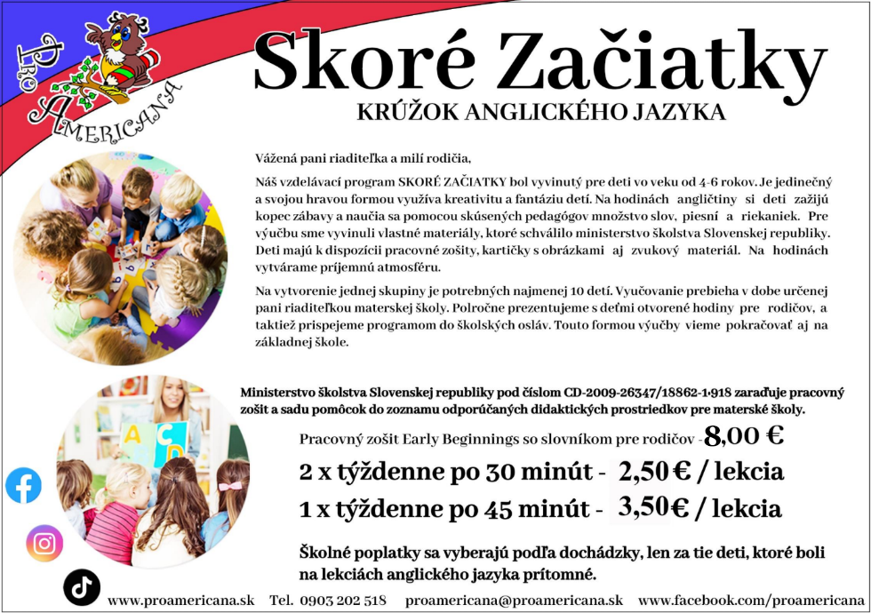 v prípade záujmu o krúžok anglického jazyka, ktorý zabezpečuje jazyková škola Pro Americana, môžete zapísať svoje dieťa do zoznamu v šatni .